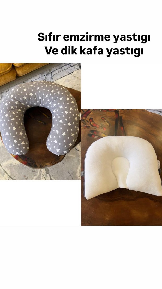 Gri yıldız desenli emzirme yastığı ve beyaz dik kafa yastığı, emzirme ve dinlenme sırasında destek sağlar.