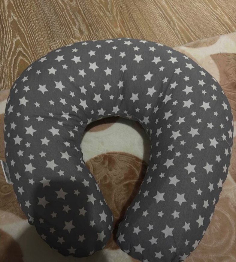 Gri zemin üzerinde beyaz yıldız desenli, hamilelik ve emzirme için konforlu yastık. ⭐
