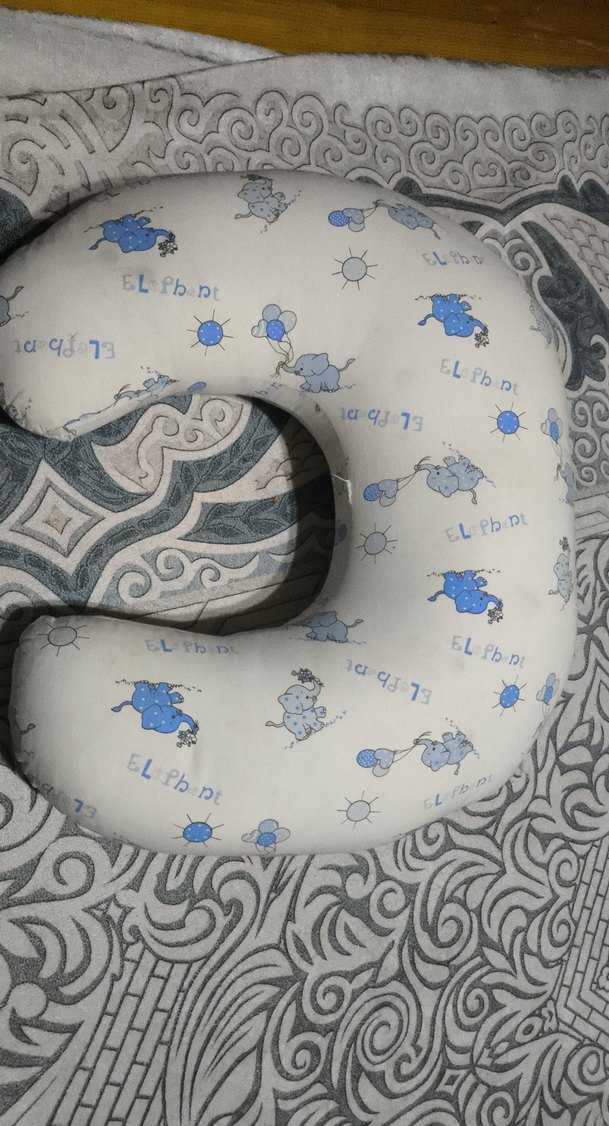 Gri renkli, mavi fil ve güneş desenleriyle süslenmiş emzirme ve hamile yastığı rahat destek sağlar. dış kılıfı fermuarlı kılıfı cikartabilirsiniz depoda saklandığı için görünen yerlerde hataları vardır