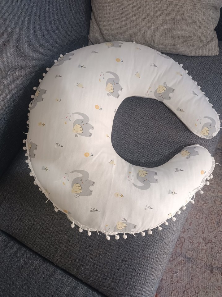 Gri renkte, fil desenli baskıya sahip emzirme ve hamilelik yastığı, konfor ve destek sağlar.