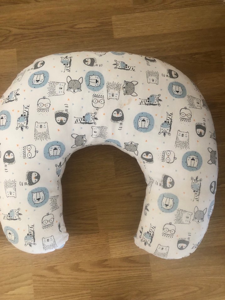 Gri renkte, sevimli hayvan desenli emzirme ve hamilelik yastığı, konfor ve destek sağlar.