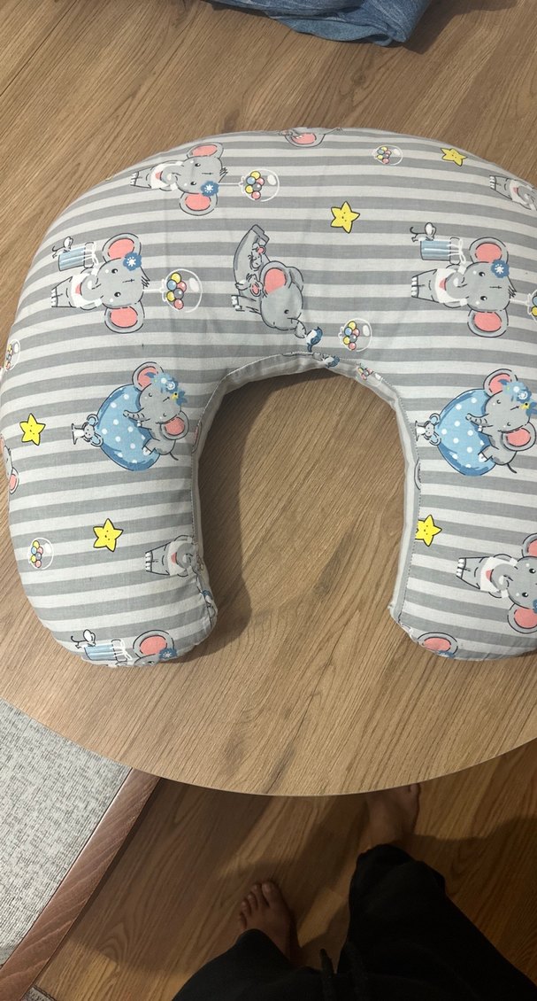 Gri renkli, sevimli fare ve yıldız desenli emzirme ve hamilelik yastığıdır. Rahat kullanım sağlar.