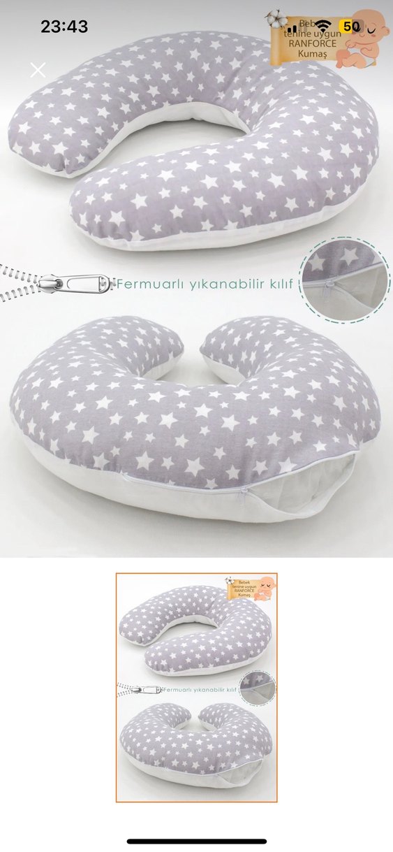 Sıfır ürün Hiç kullanılmadı Gri yıldız desenli hamilelik ve emzirme yastığı. Fermuarlı, yıkanabilir kılıfı sayesinde kolay temizlenir.