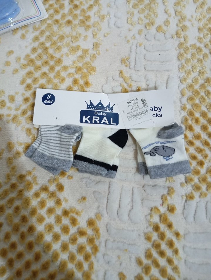 Gri renkli, desenli erkek bebek çoraplarından oluşan 3'lü set. Yumuşak kumaşlı, çizgili ve balina desenli modeller içerir.