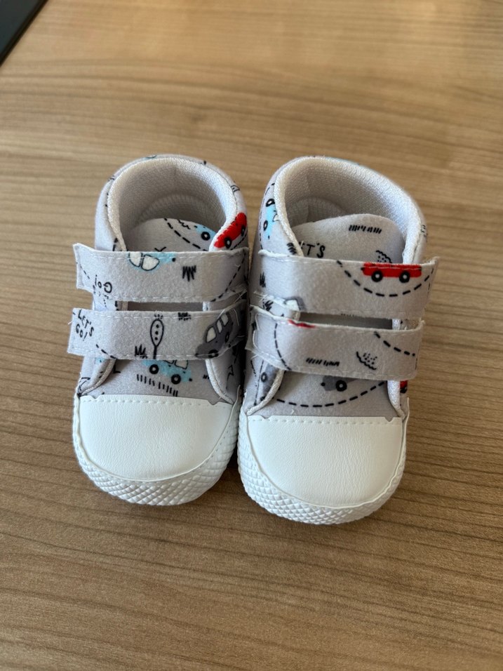 Gri renkli, baskılı desenli erkek bebek ilk adım ayakkabısı. Kolay kullanımlı cırt cırtlı, dayanıklı kauçuk tabanlıdır. Sokak stiline uygun.