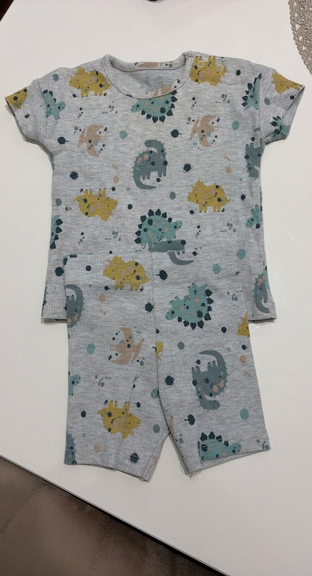 Gri renkli, örme kumaştan yapılmış erkek bebek kısa kollu takım. Üzerinde baskılı dinozor desenleri bulunur, yuvarlak yaka ve rahat kesimlidir.