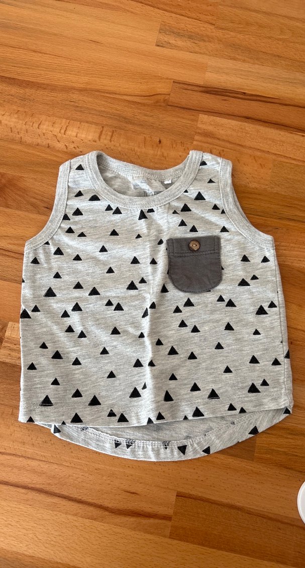 Gri renkli, kolsuz, V yaka ve bol kesim erkek çocuk yeleği. Siyah üçgen desenli ve düğmeli cepli, pamuklu kumaştan üretilmiştir.