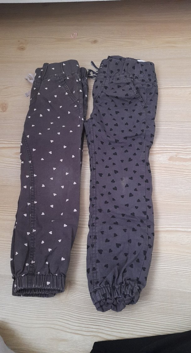 Gri tonlarında kalp desenli, elastik bel ve paça manşetli, bol kesim erkek çocuk kot pantolonları, rahat sokak stili için uygun.