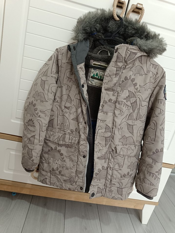 Gri renkli, baskılı dinozor desenli, kürklü kapüşonlu, notched lapel yakalı, bol kesim erkek çocuk montu. Yumuşak ve sıcak polar kumaştan üretilmiştir. İngiltereden getirtildi özel orjinal marka dar geldiği için satıyorum