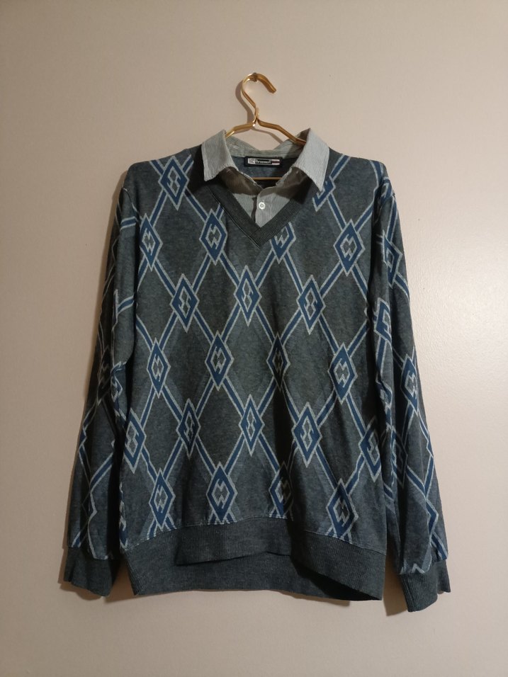 Gri renkli kumaştan yapılmış, kolye yaka ve geniş kesime sahip, elmas desenli erkek kazak. Günlük kullanım için uzun kollu ve normal boyda.