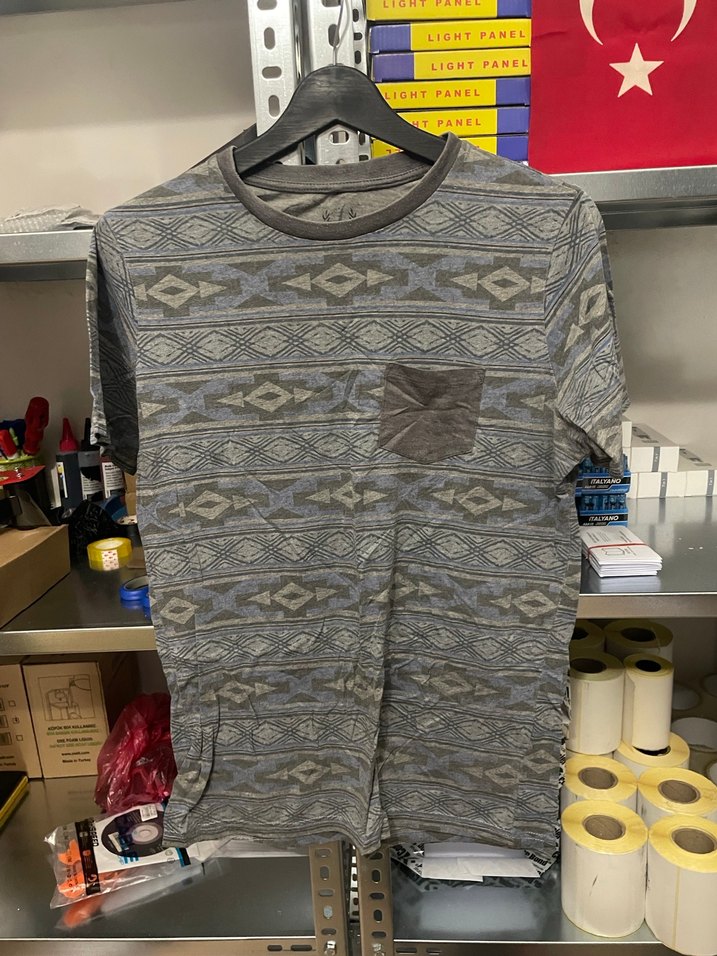 Gri renkli, kısa kollu erkek tişörtü, gevşek kesim ve örme dokusu ile geometrik desenlere sahiptir. Ön cep ve bisiklet yaka ile günlük kullanıma uygundur.