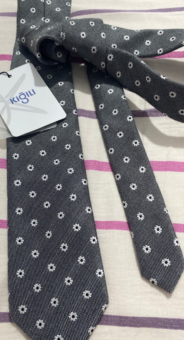 Kiğılı markasına ait, küçük beyaz çiçek desenli gri erkek kravat, iş ve günlük sokak stiline uygun.