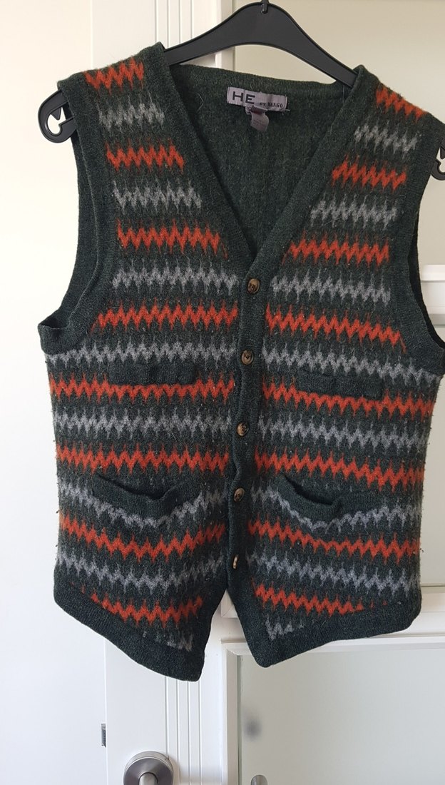 Gri renkli, desenli ve örgü yün yelek, çıtçıtlı, cepli ve kolsuz. Günlük kullanıma uygun, vücuda oturan kesimde.