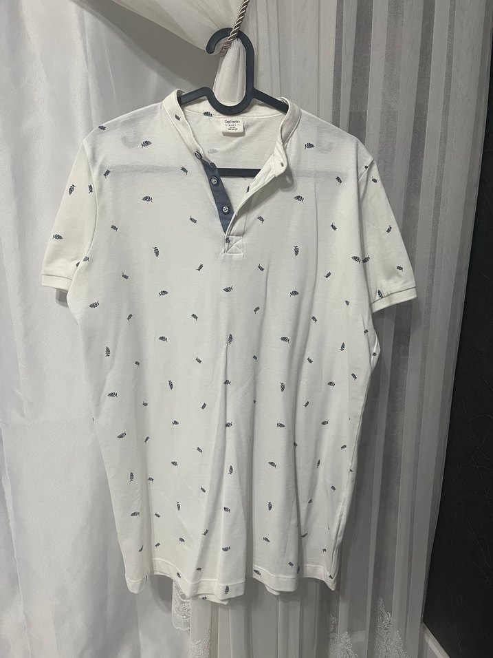 Pamuk kumaştan, düğmeli yakalı, kısa kollu ve bol kesim erkek polo tişört. Beyaz zemin üzerine gri baskılı desenlere sahiptir.