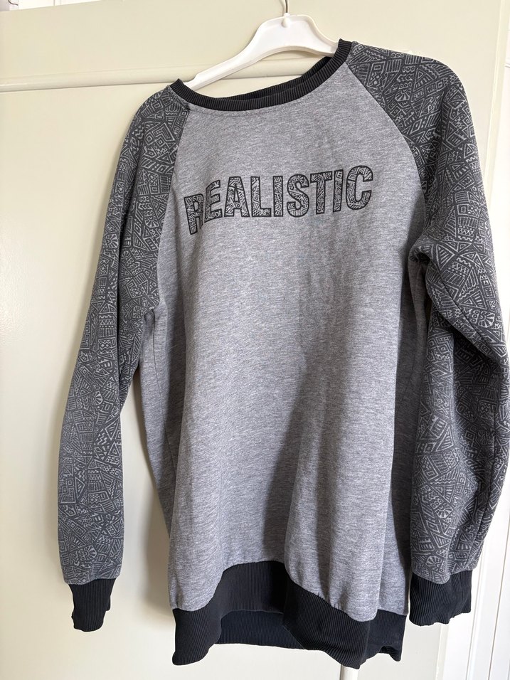 M beden Gri, yuvarlak yaka, uzun kollu ve bol kesim erkek sweatshirt. Desenli örme kollar ve önünde "PEALISTIC" yazısı bulunur. Günlük sokak stili için uygundur.