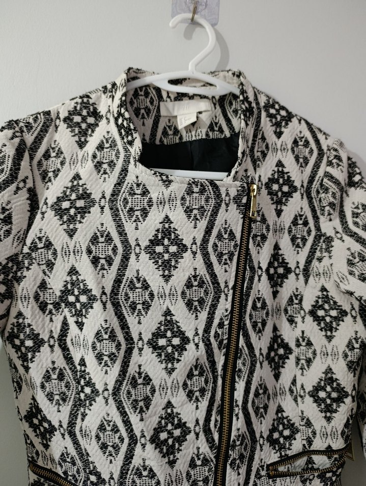Gri desenli, fermuarlı ve vücuda oturan kesime sahip kadın ceketi. Uzun kollu ve yakası kesik detaylı, bohem tarzda, sentetik kumaştan üretilmiştir.