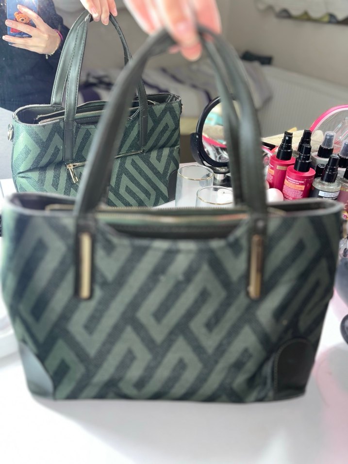 Gri desenli sentetik kumaştan yapılmış, fermuarlı bölmeleri bulunan bu çağdaş kadın çantası, günlük kullanım için uygundur. Defosu yok fermuarı çalışıyor
