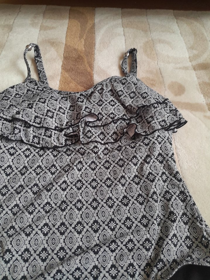 Askılı, fırfırlı detaylara sahip, gri desenli ve vücuda oturan kadın mayosu. Bohem tarzı yansıtır, günlük kullanıma uygundur. marka