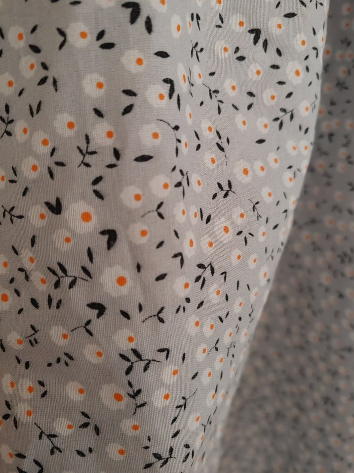 Yumuşak sentetik kumaştan, gri renkte, desenli ve fırfırlı uzun, bol kesim hamile eteği.