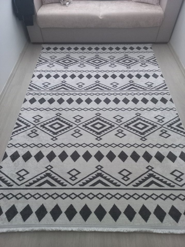 Gri renkli, geometrik desenlere sahip geleneksel tarzda halı. Yumuşak dokusu ve nötr renkleriyle her odaya uyum sağlar.
