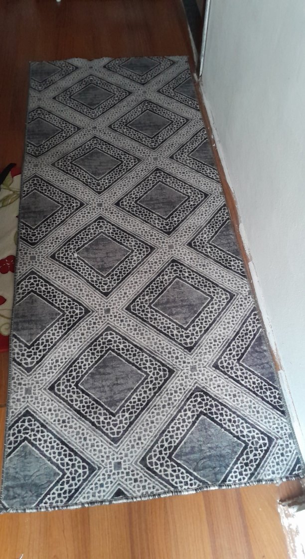 Desenli, geleneksel tarzda gri renkli halı, elmas desenleriyle klasik bir dokunuş sağlar. en 80 boy 200 alındı ama kullanılmadu 600 alındı yakışmadı içn satyrum