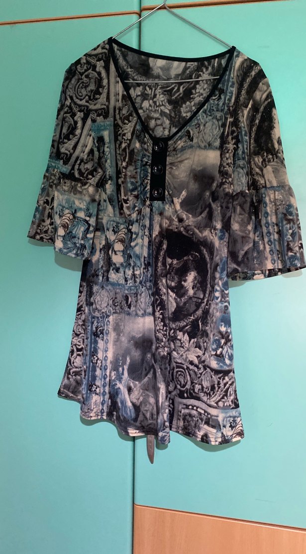 Gri desenli, bol kesim gotik hamile tunik. Kısa volanlı kollu, düğmeli V yaka ve midi boy günlük kullanım için uygun.