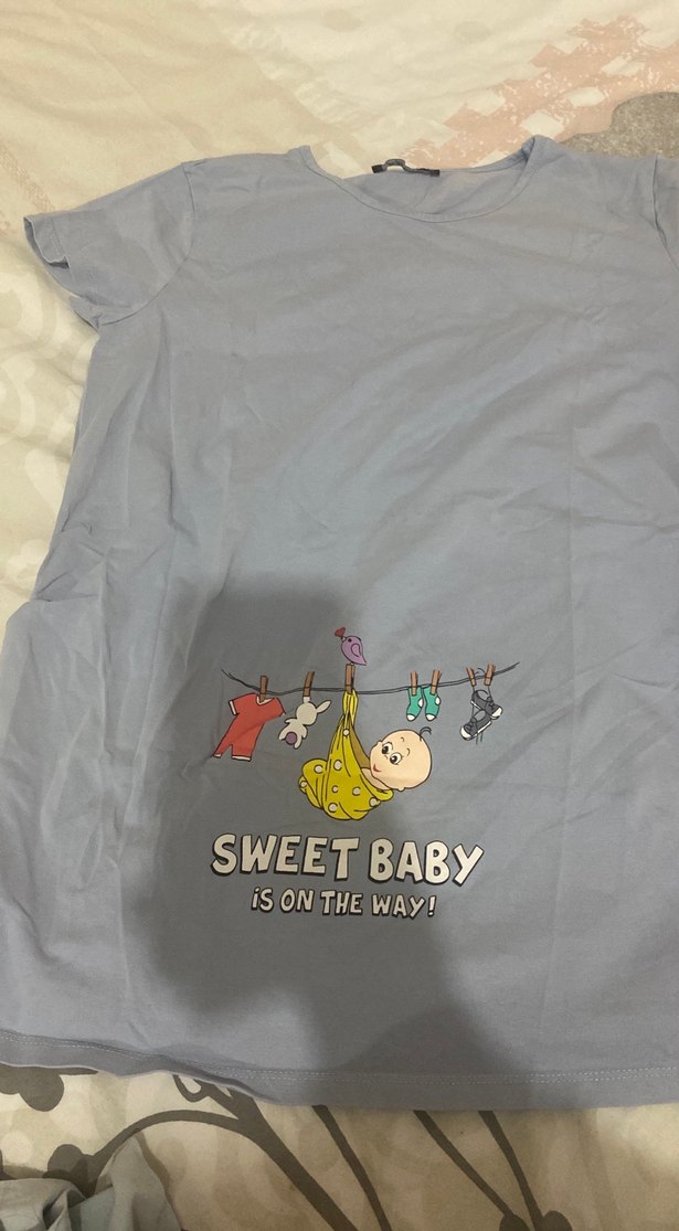 Bu gri renkli, kısa kollu hamile tişörtü, baskılı bebek teması ve "SWEET BABY is ON THE WAY!" yazısı içerir.
