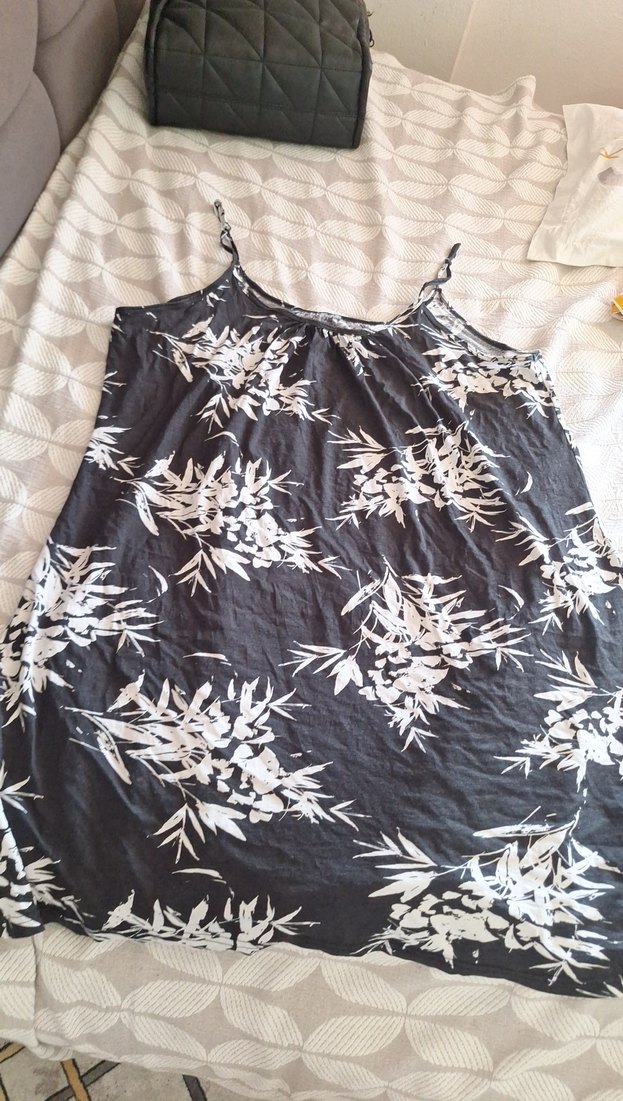 Askılı, gri renkte, loose fit kesim hamile ve emzirme geceliği, midi boyda ve sade desenlidir.