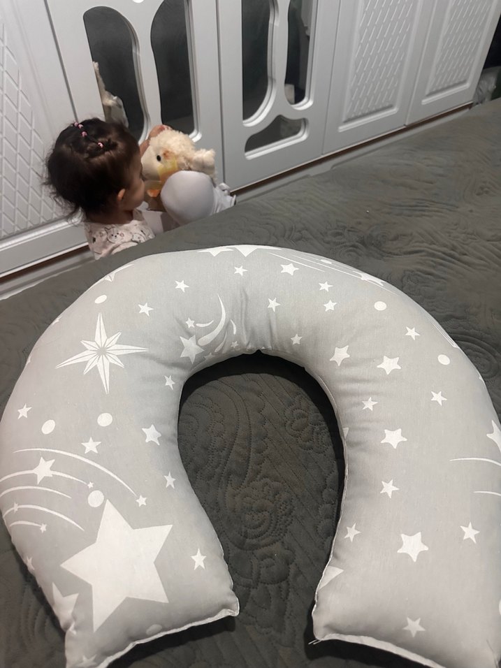 Gri, yıldız ve ay desenli hamile ve emzirme yastığı, konfor ve destek sağlar.