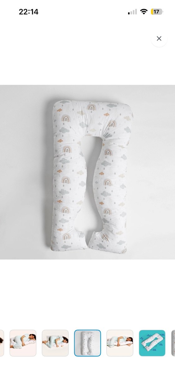 Gri ve bej gökkuşağı ile bulut desenli beyaz yumuşak kumaşlı hamile ve emzirme yastığı, destek ve rahatlık sağlar.