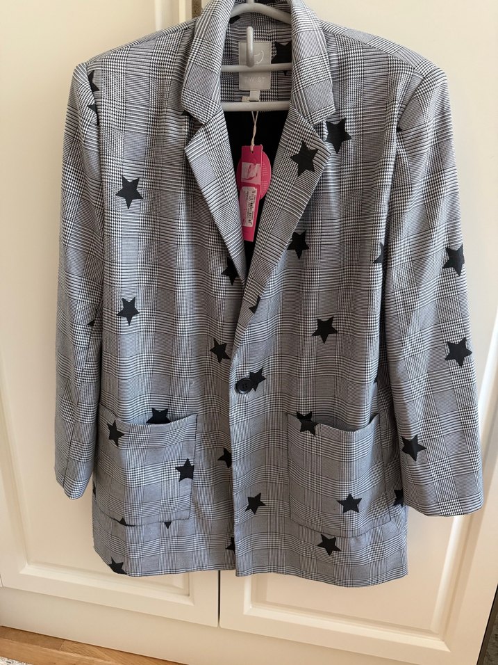 Gri renkte, yıldız desenli, düğmeli, normal uzunlukta ve regular fit kadın blazer ceket. Uzun kollu ve ofis kullanımı için uygundur. ⭐Hiç kullanılmamış etiketli