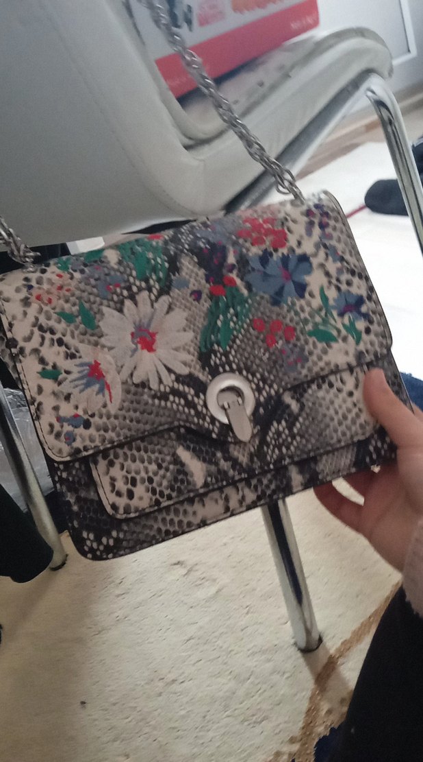 Gri desenli çanta, çiçek desenleri ve tokalı kapanışıyla bohem ve Paris etkisini bir araya getiriyor. Günlük kullanıma uygun.