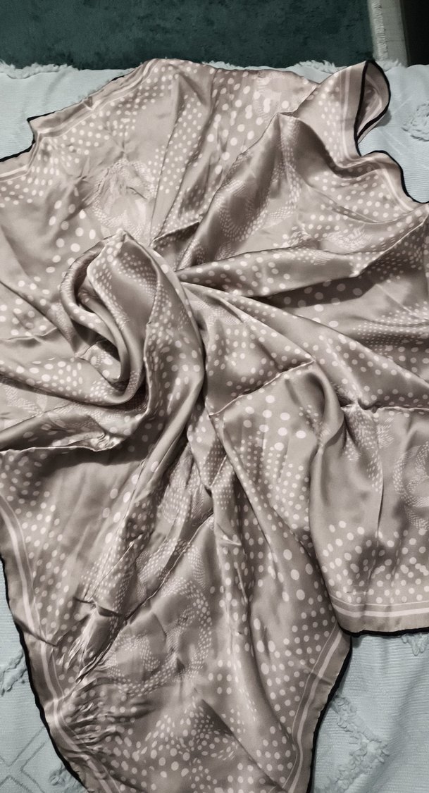 Yumuşak ipek kumaştan, gri renkte ve desenli, çağdaş vintage tarzda kadın şalı. Moda tutkunları için ideal.