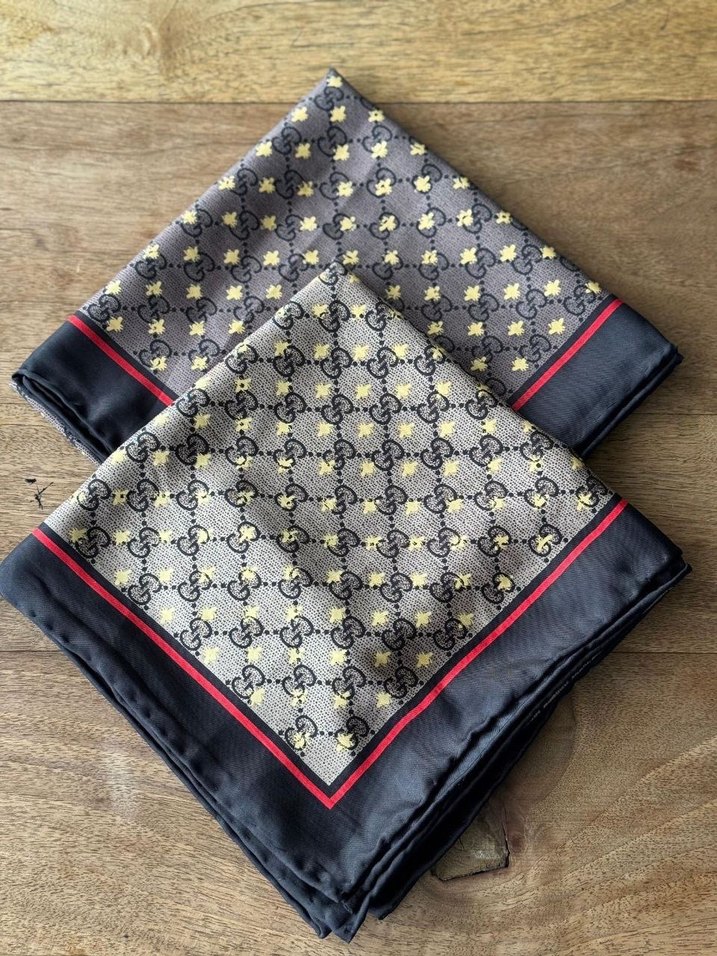 Kadınlar için gri sentetik kumaştan, drapeli tasarıma sahip, Paris sokak modasını yansıtan vintage desenli fular. Kırmızı ve siyah detaylar içerir.