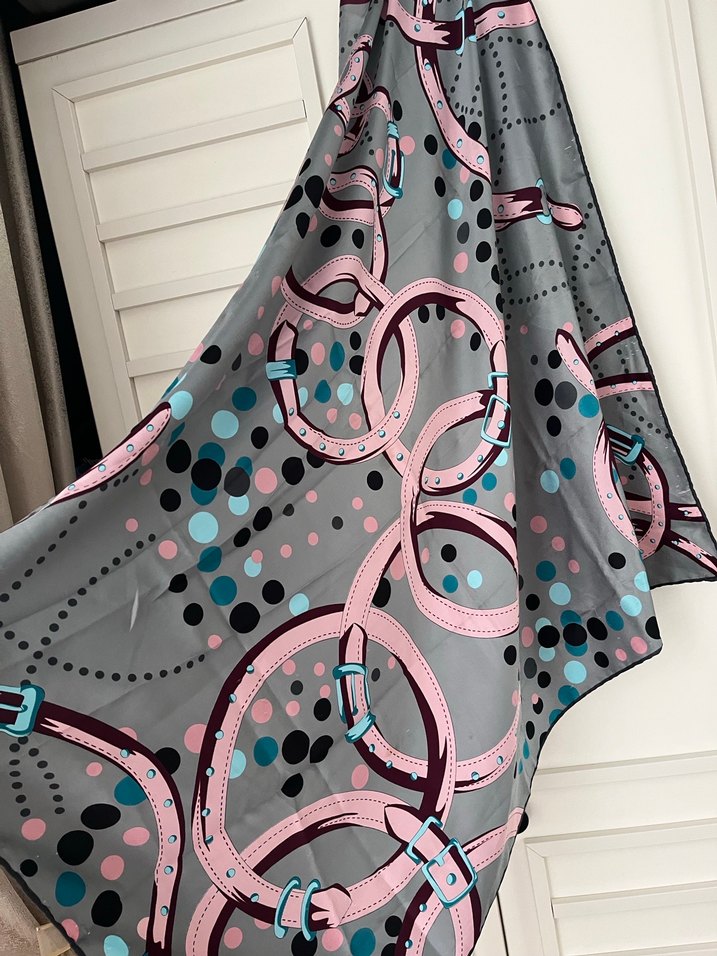 Kadınlar için gri tabanlı, pembe ve mavi halkalarla avant-garde desenli, dökümlü yapıya sahip şal. Yumuşak sentetik kumaştan, çağdaş tarzlara uygun.