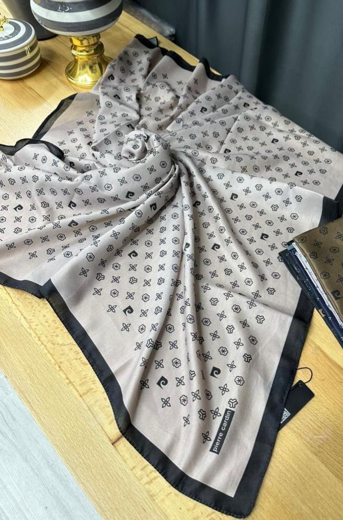Yumuşak sentetik kumaştan, siyah bordürlü ve desenli gri kadın şalı, rahat ve şık sokak stili için uygundur.