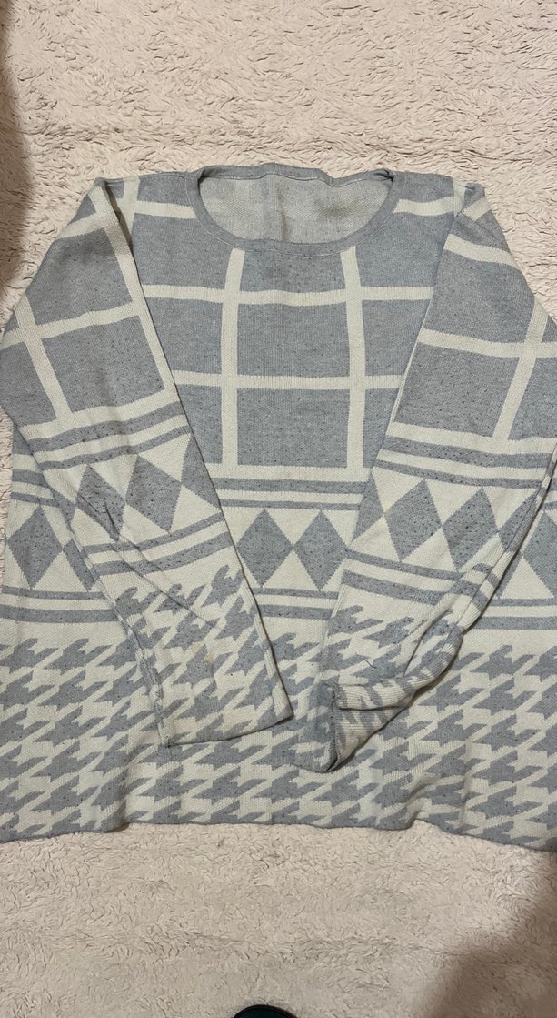 Gri renkli, uzun kollu kadın triko kazak, rahat kesim ve yuvarlak yaka ile gündelik sokak stiline uygundur. Geometrik desenlere sahiptir.