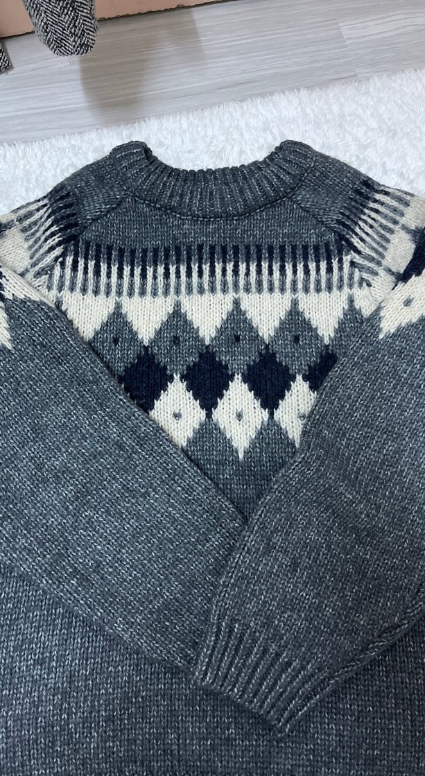Gri tonlarda desenli, ince örgüden yapılmış, bisiklet yaka ve uzun kollu, normal boyda, kadınlara özel dar kesim triko kazak.