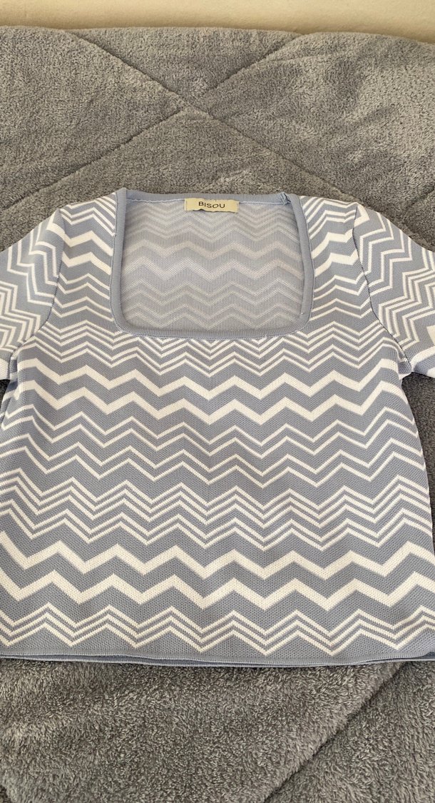 Gri zigzag desenli, kısa kollu ve kayık yaka kadın triko bluz. Yumuşak sentetik örgü kumaştan, bohem tarzda, günlük kullanım için uygun.