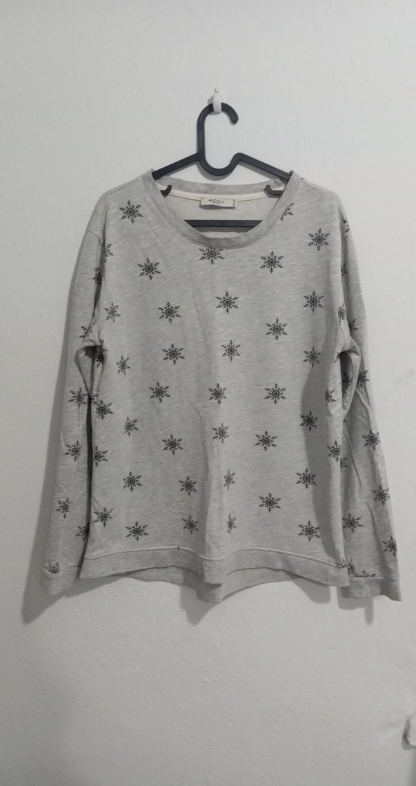 Gri renkli, uzun kollu ve yuvarlak yakalı bu triko sweatshirt bol kesimdir. Baskılı kar tanesi desenleri ve orta uzunlukta, yumuşak ve sıcak kumaştan üretilmiştir. ❄️