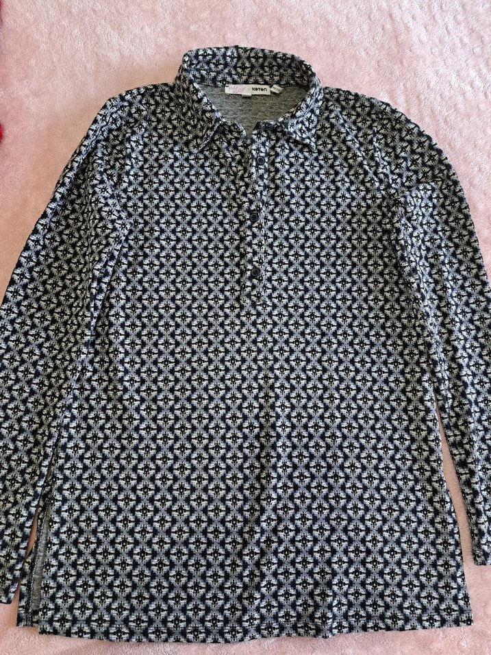 Gri renkli, yakalı ve düğmeli, uzun kollu kazak kadın . Baskılı deseni ve bol kesimiyle günlük rahat kullanıma uygundur. ✨