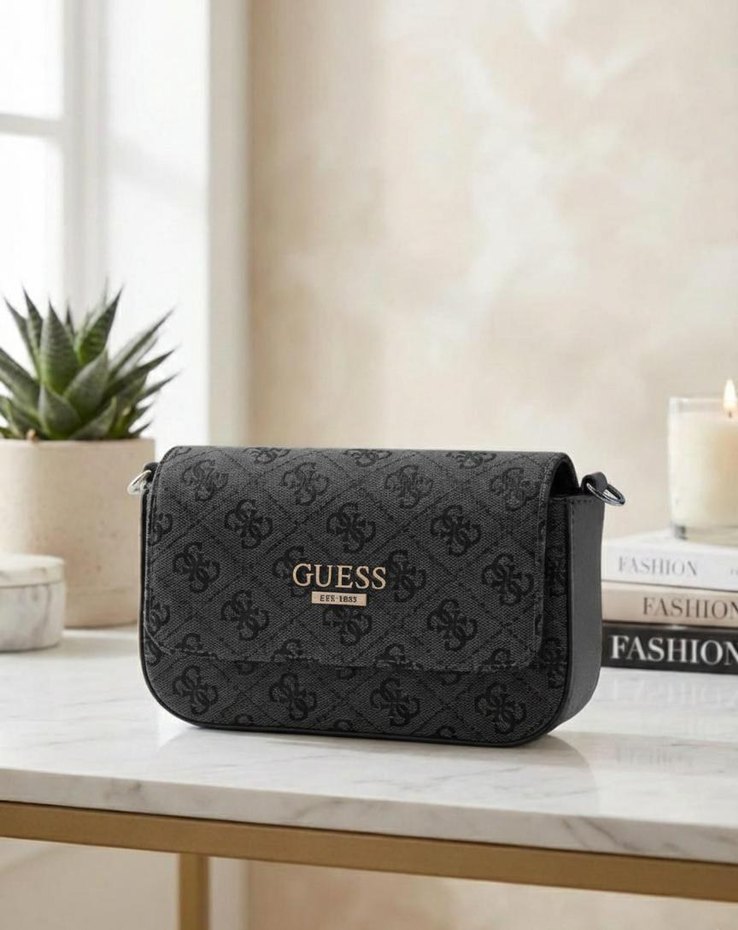 Modern klasik tarzda, kemerli ve gri desenli sentetik kumaştan kadın çantası. GUESS logosu bulunur ve günlük kullanıma uygundur.