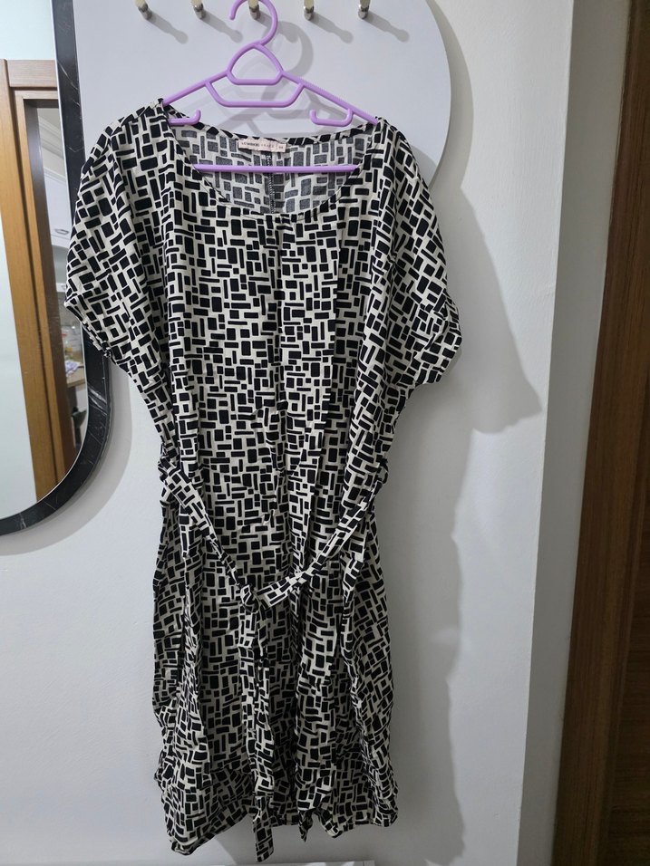 Gevşek kesim, kısa kollu, V yakalı midi elbise. Geometrik desenli ve kemerli, sentetik kumaştan, sokak stili için uygun.