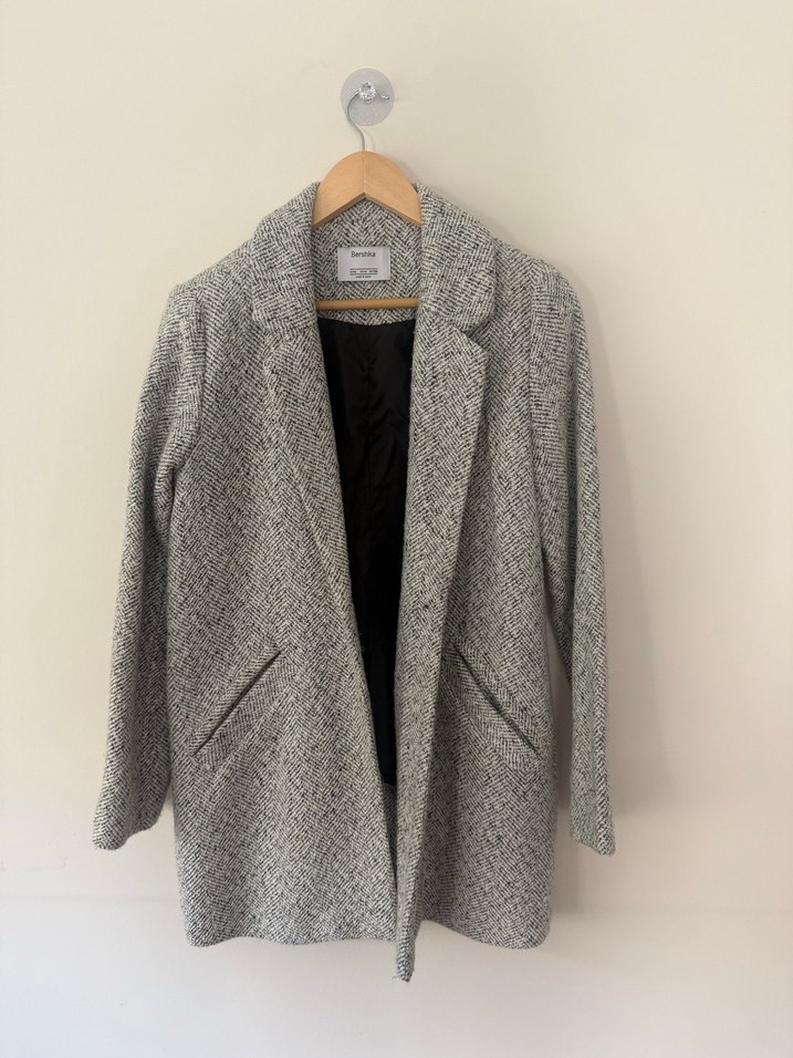 Yumuşak dokulu, gri desenli kısa kaban, ön cepler ve klasik yaka detaylarıyla. İç kısmı siyah ve pürüzsüz astarlıdır.