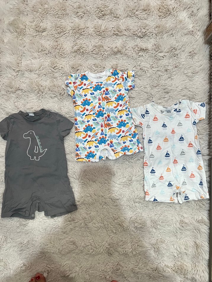 Pamuklu, kısa kollu ve bisiklet yakalı üç farklı erkek bebek tulumu. Gri dinozor baskılı, renkli hayvan desenli ve beyaz gemi baskılı modeller. Örgü dokusu rahatlık sağlar.