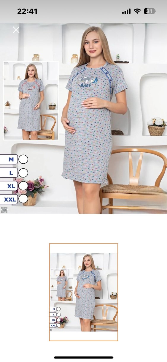 Gri renkli, baskılı ve kısa kollu, bol kesim hamile geceliği. Önünde "BABY" yazısı bulunur. Yenidir bir kaç kez kullanıldı ve emzirme kolaylığı vardır.
