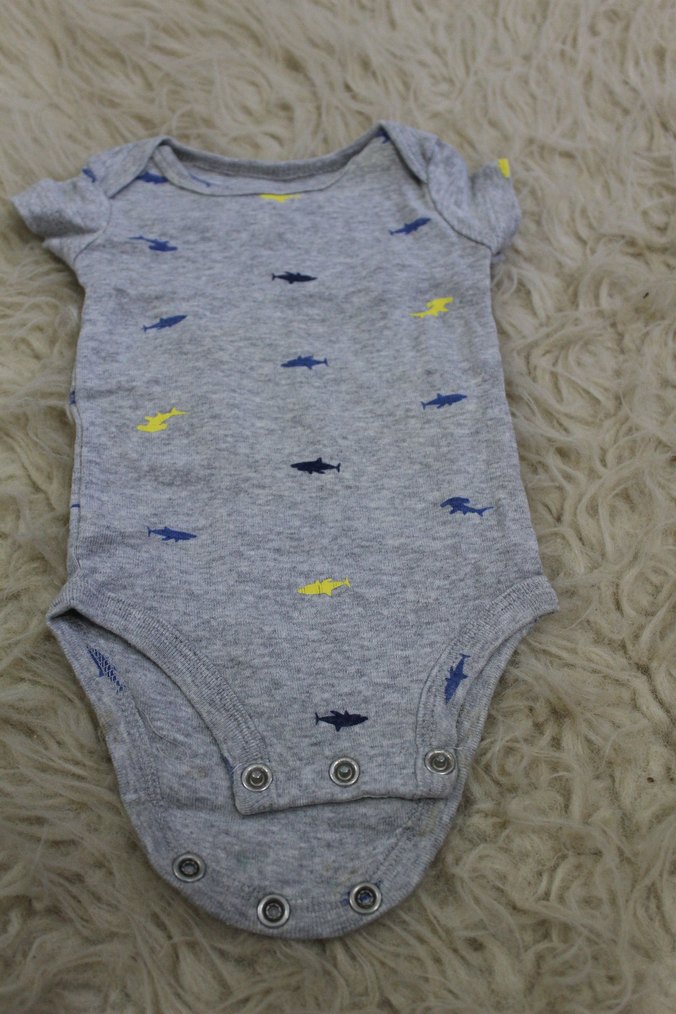 Kısa kollu, yakalı ve örme kumaştan yapılmış gri bebek zıbını, baskılı desenlidir.