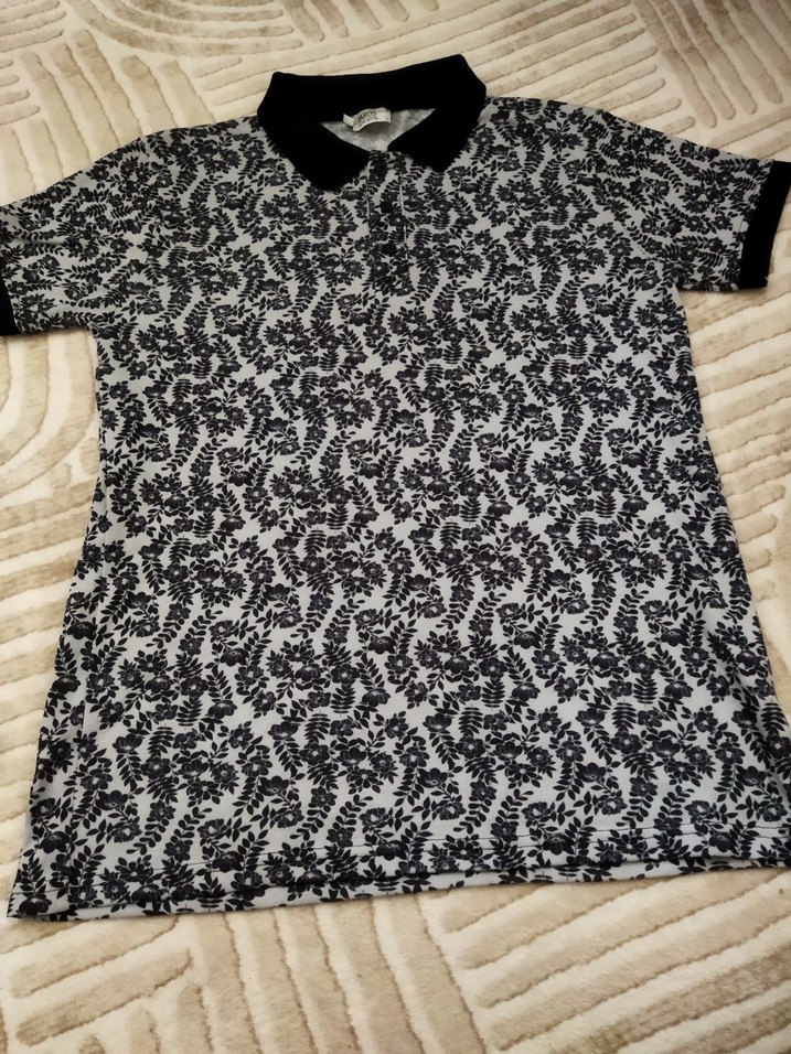 Gri yaprak desenli, siyah yakalı kısa kollu polo tişört. Sentetik kumaştan, dantel detaylı, günlük rahat sokak stili için uygun, dar kesim ve normal boyda. ürün az kullanıldı yeniden farksız ölçüleri görselde mevcut