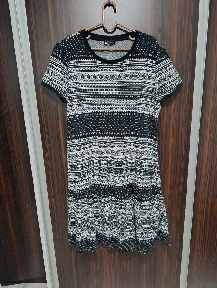 Gri renkte, kısa kollu, yuvarlak yakalı, desenli ve bol kesim triko mini elbise. Günlük kullanıma uygun bohem tarzda bir model.