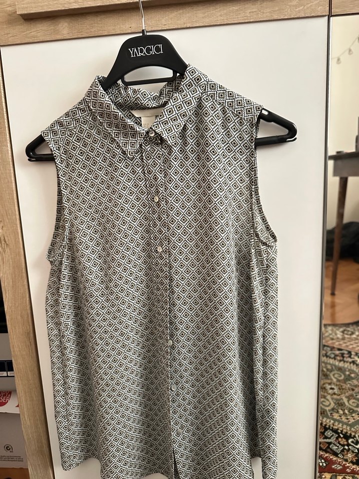 Pamuklu, kolsuz, yakalı ve düğmeli gömlek. Gri tie-dye desenli, bol kesim, günlük kullanıma uygun.